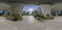 Aerial view of the vibrant city of Miami, Florida. High rise buildings surround a bustling plaza with an open walkway. Clear sky creates a perfect backdrop to showcase Miami's urban design and residential areas.