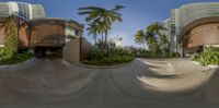 A sunny day in Miami, Florida. The image captures a 360-view of a parking lot and building, showcasing urban design and the straight road ahead. The clear sky and hard shadows create a striking contrast in this urban residential area.