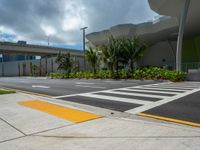 A sunny day in Miami, Florida with an urban landscape. Palm trees line the road with a crosswalk for pedestrians. The vibrant greenery and clear sky create a picturesque scene of urban design.