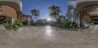 A sunny day in Miami, Florida. The image captures the urban landscape of the city, with concrete streets and parking garages. The straight road leads to residential areas with houses and hotels. Clear sky and hard shadows enhance the urban design.