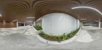 A fish-eye view of the interior of a large building in Miami. The concrete surfaces are illuminated by neon lights, creating a vibrant and energetic atmosphere. The space is filled with plant life, adding a touch of nature to the urban environment.