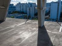 An aerial view of Miami's skyline, with skyscrapers towering over the city. The skateboarder rides down an empty cement street, casting a hard shadow. The urban landscape is contrasted with the clear blue sky.