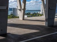 Aerial view of Miami's skyline and the waterfront from a high position. The photo captures an empty parking lot beside a concrete pier, with the clear blue sky and fluffy clouds overhead.