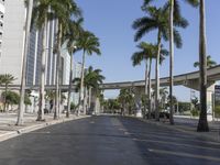 A deserted street in Miami, lined with palm trees and modern architecture. Bridges and underpasses crisscross the cityscape. The asphalt road leads to a parking lot, surrounded by urban vegetation. Miami's vibrant city life in one scene.