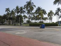 Classic architecture meets the tropical vibes of Miami in this suburban public space. Tall palm trees and a clear sky dominate the scene. People walk past a parking area with a restaurant, adding vibrancy to the neighborhood.