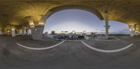 the view from inside a concrete tunnel looking into the city, with the sky behind