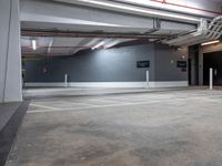 A dark night in Miami. An empty parking garage with neon lights illuminating the concrete walls. Several storage spaces and entryways are visible. A warehouse symbolizing the urban landscape of Miami Beach.