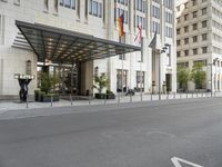 A motorcycle speeds down the road in front of a modern mixed-use building in Berlin. The building's many windows showcase the city's classic and modern architecture. Located in the vibrant Potsdamer Platz neighborhood, it offers a glimpse into the bustling city life of Berlin.