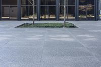 A modern and symmetrical high-rise office building in Toronto, Ontario. The concrete facade and composite material walkway create a striking urban design. The business district comes alive with the hustle and bustle of city life.