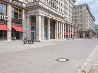A classic architecture building in Berlin, Germany. The mixed-use property blends in with the surrounding neighborhood. The concrete facade with a storefront and awning creates a welcoming atmosphere. A perfect example of real estate in Europe.