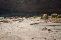two people standing on rocks looking at something in the distance, along a canyon side path