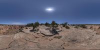 a wide shot of an arid landscape with rocks and plants with sun over the sky