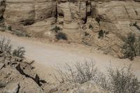 This is an image of the rugged landscape of Moab, Utah in the USA. The red rock formations in the canyonlands create a stunning and unique scenery. The clear sky highlights the elevated mountain landforms and the steep slopes covered in vegetation. A dirt road meanders through the terrain, providing an off-road track for adventure seekers. The sandy streets and gravel paths add to the natural beauty of the desert environment. This photo captures the essence of the high desert in Utah, where nature and the bedrock formations coexist in perfect harmony.
