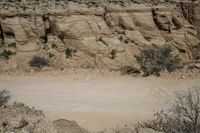 a motorcycle driving through a sandy desert canyon road with tall rock walls in the background