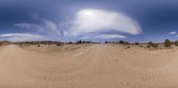 a panorama mirror view of a desert and some bushes on the side of a dirt road