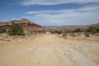 a dirt road going through the desert area with a mountainside in the distance with blue sky and clouds in the distance