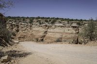 a road in the desert with large rocky sides and greenery on both sides of it
