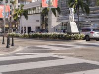 An image showcasing the modern architecture and urban design in Los Angeles, California, USA. The cityscape features tall buildings, with sleek designs and large windows. The asphalt road surrounded by trees and vehicles adds to the urban atmosphere. The vibrant city neighborhood is filled with shops and storefronts. In the foreground, there is a well-maintained road surface with a visible crosswalk and curbs. The image captures the essence of urban life and the dynamic infrastructure of Los Angeles, with palm trees and street lights providing a unique touch.