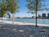 This is an image of a waterfront in Holland, Europe. The modern architecture of the buildings and the cobblestone path create a charming urban design. The clear sky reflects on the azure water of the river, creating a picturesque scene. People are seen enjoying a relaxing day near the water's edge, walking on the brick path. Trees and vegetation surround the area, providing a peaceful atmosphere. This photo represents the vibrant city life and urban infrastructure of Holland.