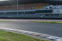 Daytime race at the Suzhou Race Track. Modern architecture surrounds the low-lying arena and stadium. The asphalt road snakes through the track, while vegetation and grass line the edges. Excitement and speed abound!