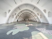 This stock photo features a stunning display of modern architecture in an art-filled hall located in Shanghai, China. The hall is characterized by its open space, straight down the road design, and composite material structure. The floor and floor tiles are adorned with intricate animal designs, adding a touch of artistic flair to the space. The tunnel-like structure and urban design create a unique and captivating atmosphere. The ceiling, made of concrete, complements the overall aesthetic of the hall. This image captures the essence of city life and showcases the vibrant urban art district in Shanghai, with Hangzhou and Suzhou also acting as structural elements in the background. Ideal for publications and websites related to architecture, museums, and urban design.