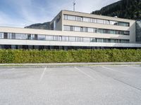 This is an image of a modern building in Austria. The clean white architecture stands out against the clear sky and is surrounded by large bushes. The surface in front of the building is an asphalt parking lot. The landscape of the surrounding mountains and nature adds to the elegance of the scene. This photo captures the beauty of modern architecture in a natural setting.