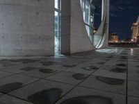 Berlin at night showcases modern architecture with concrete structures illuminated by artificial light. Wet surfaces and urban roads contrast under the dark European sky. A glimpse into Berlin's architectural advancements and urban charm.