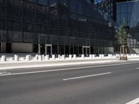 This image captures the urban landscape of Berlin, Germany. The empty street is lined with modern office buildings and futuristic architecture. The grey asphalt road is flanked by white pillars and fenced streets, creating a sense of urban design. This scene is located in the financial district of the city, reflecting the bustling business and metropolitan area. The facades of the buildings exhibit a mix of modern and traditional architecture. This photo represents the dynamic and vibrant atmosphere of Berlin's business district.
