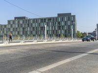 A modern architecture marvel in Berlin, Germany. Residential and business district with sleek office buildings and urban design. Empty road lined with buildings, a car crossing, and a lady walking on the bridge.