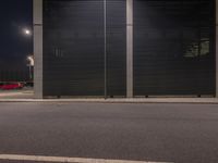 A night view of modern architecture in Berlin, Germany. The black metal facade and red tinted windows create a dark and urban atmosphere. The road surface, lined with trees, adds to the overall aesthetic of the scene.