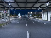 This is an image of a modern architecture in Berlin, Germany. The photo captures a straight road lined with artificial lights, leading to an underpass and bridge in the distance. The night sky adds to the dark ambiance of the scene. The road surface, made of asphalt, reflects the lights, giving a futuristic feel to the image. This photo represents the metropolitan area of Berlin, showcasing its modern infrastructure and transportation network. It is a symbol of the dynamic and vibrant city life in Europe.
