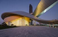 A view of a modern, low-rise office building in a futuristic business district. The straight road leads to a mix of urban design and open spaces. The concrete facade and structural elements create a unique blend of art and architecture.
