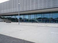 A view of a modern architecture building in the financial district of Berlin. The concrete street leading to the building is lined with trees, providing shade. The courtyard of the building serves as a gathering place for urban professionals.
