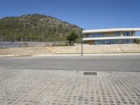 A modern architecture building in Mallorca, Spain, surrounded by a clear sky and beautiful landscape. The paved walkways and open courtyard create a welcoming entrance to this residential property.