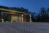 A modern residential building in Toronto, Canada. The low-rise structure features a composite material facade and is surrounded by trees and vegetation. The parking lot is well-lit with artificial lights. A perfect blend of modern architecture and natural landscape.