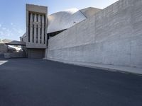 A modern architecture building in Spain with a facade made of composite materials. The Brutalist design features clean lines and a concrete wall. The clear sky casts shadows on the urban road surface.