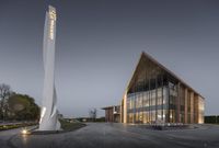 the outside of a building with glass windows, a clock tower and an illuminated statue in the foreground