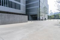 A modern concrete wall in Shanghai's business district, capturing the essence of urban design. The open space and benches in the foreground add to the city life atmosphere. A perfect composite of modern architecture and public space.