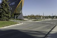 This stock photo showcases the modern architecture of an office building located in the bustling business district of Toronto, Canada. The tall building stands tall against a clear sky, with its sleek design and triangular shape catching the eye. The streets below are lined with asphalt roads and tree-lined sidewalks, creating a vibrant urban atmosphere. The image captures the essence of city life and urban design, with the business district serving as a hub for financial activities. The well-maintained road surfaces, street lights, and curbs contribute to the overall aesthetic of the scene. This photo is perfect for showcasing the urban landscape and modern architecture in Toronto.
