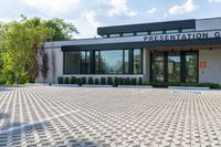 A modern office building in Toronto's business district. The sleek facade and architecture make it stand out among the surrounding vegetation. Clouds float above, adding drama to the city skyline.