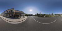 A fish-eye lens view of a school building in a bustling city center. Modern architecture and brick walls create a unique urban design. Clear skies highlight the vibrant city life.