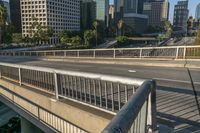 This stunning stock photo showcases the impressive skyline of downtown Los Angeles at dawn. The modern architecture, skyscrapers, and office buildings create a vibrant and dynamic cityscape. The image captures the essence of city life in the bustling metropolis of Los Angeles, California, USA. The clear sky adds to the urban design and grandeur of the city. The asphalt roads and guard rails lead the way through the metropolitan area, guiding the flow of traffic. The bridge and skyway stand as iconic landmarks, while the handrail adds a touch of detail to the urban scene. This image perfectly represents the urban charm and business district of Los Angeles. It is ideal for projects related to architecture, urban development, city planning, or any topic exploring the vibrant city of Los Angeles.