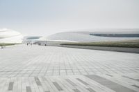 This stock photo showcases a modern urban landscape in a bustling city. People are seen walking on a concrete pavement surrounded by large white buildings with geometric shapes and columns. The open space, clear sky, and futuristic architecture create a dynamic and futuristic atmosphere. The plaza provides an inviting area for visitors to explore and enjoy the city's vibrant culture. This image captures the essence of a modern metropolis with its sleek architectural design and bustling urban activity. Perfect for illustrating concepts related to architecture, urban development, and contemporary city life.