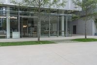This is an image of a modern glass-walled building in the business district of Shanghai, China. The building features many stores and cafes, with trees lining the sidewalk outside. The urban design and contemporary architecture reflect the city's vibrant and bustling atmosphere. This photo represents the intersection of business, shopping, and city life in China. The glass facade, along with the aluminium fixtures, create a sleek and modern look. The building stands out among the concrete and surface of the surrounding area. This image represents the thriving real estate and urban development in Shanghai, China.