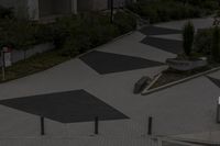 this view looks like an outdoor city plaza with black and white painted arrows on it