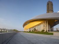 This image captures the modern architecture of a city at dawn. The buildings, with their sleek facades and composite materials, stand tall against the clear sky. A road surface leads through the urban landscape, lined with trees and vegetation providing a touch of shade. In the business district, office buildings and museums rise as structural elements of the city's urban design. The concrete surfaces reflect the city life and its futuristic architecture. This photo showcases the dynamic and bustling atmosphere of a city awakening to a new day.