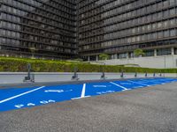 Modern architecture in Deutschland's business district. Electric charging stations line the urban landscape of Hamburg. Office buildings and parking decks showcase urban design in a bustling city environment.