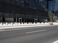 This stock photo features a paved road with black buildings and glass windows on it, leading towards a large futuristic office building. The image captures the modern architecture and urban design in Berlin, Germany's financial district. The grey road surface and curb create a sleek and metropolitan atmosphere. The city life and bustling business district of Europe's thriving metropolis can be seen in the background.