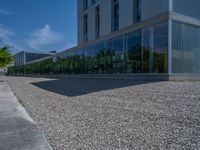 A modern office building in Spain's business district, characterized by its glass walls and hard shadows. The concrete and gravel surfaces add an urban touch to the architecture. This European structure stands against a clear sky.