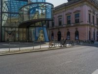 Urban city life in Berlin, Europe. Modern architecture featuring glass walls and cobblestone roads. Clear sky accents the glass surfaces. A glimpse into urban design in Germany.